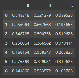 data = pd.DataFrame(np.random.rand(7, 3), columns=['A', 'B', 'C'])