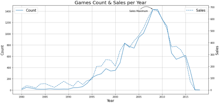 ax12.set_title('Games Count & Sales per Year', fontsize=20)