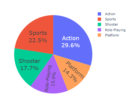 #plt.pie(genre_top5['Global_Sales'], labels=labels, shadow=True, startangle= 90, colors=colors, autopct='%.1f');