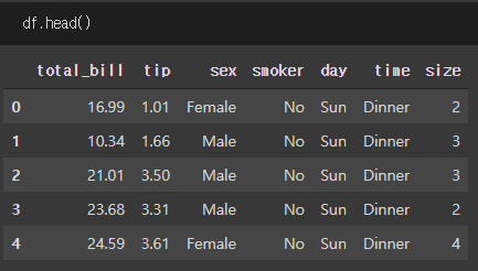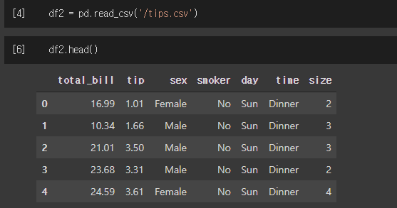 위에서 업로드한 tips.csv 파일을 DataFrame 형태로 변환하여 불러왔다.